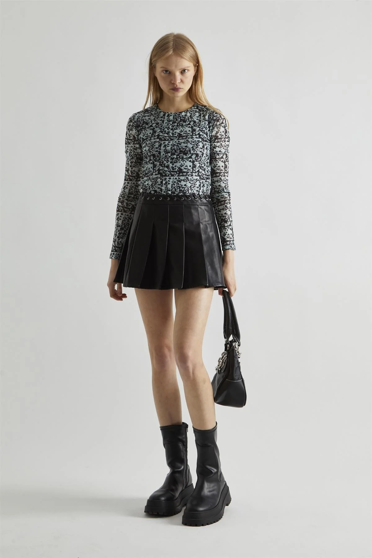 Black-PU Pleated Mini-Skirt