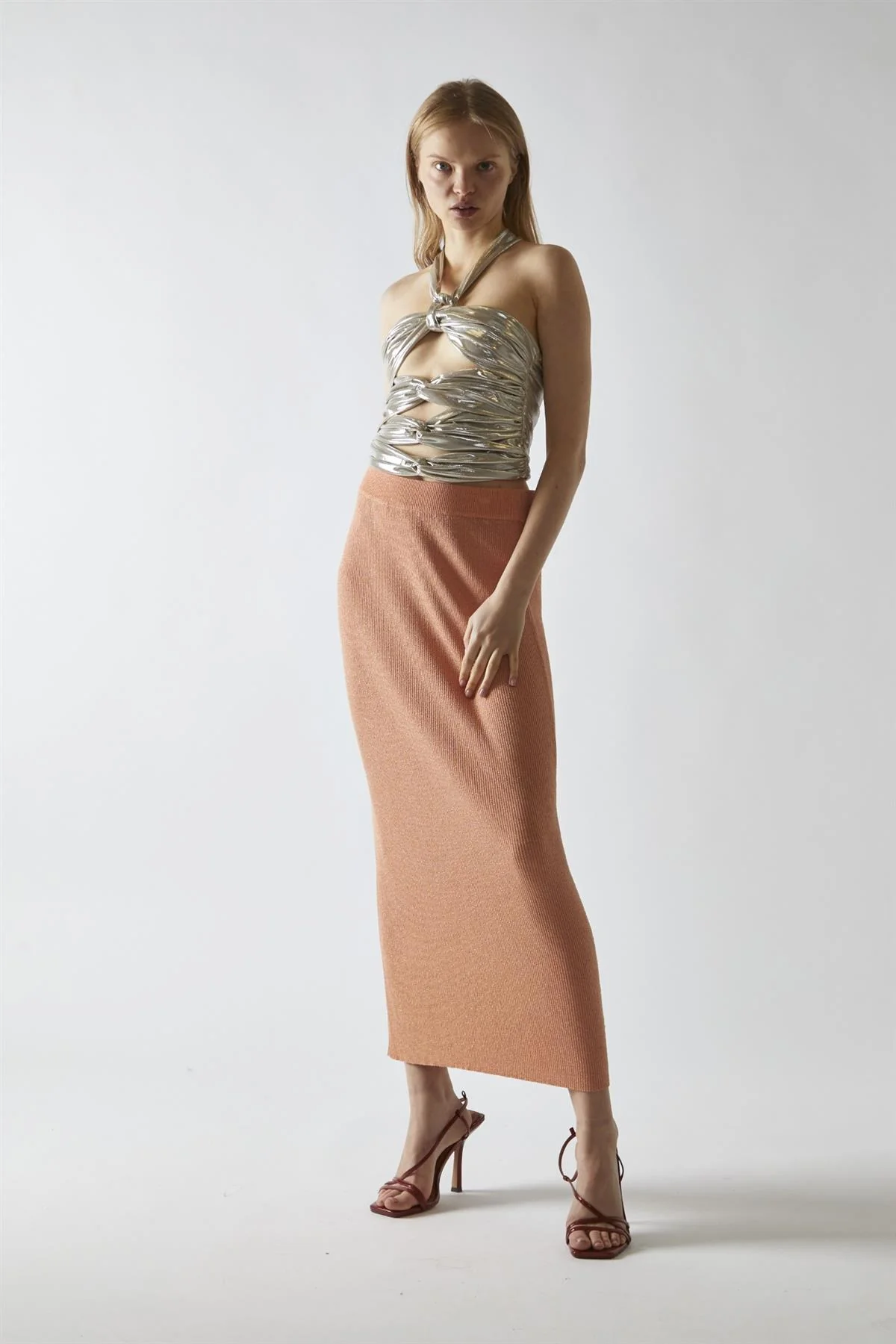 Champagne-Lame Twist-Front Cut-Out Halterneck-Top